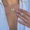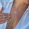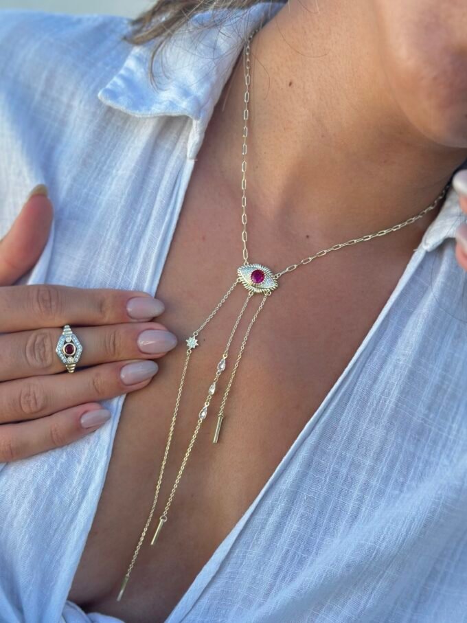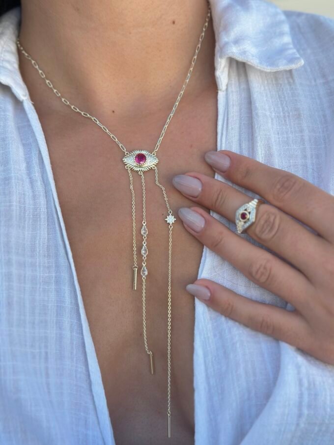 Fuşya pembesi taşıyla göz alıcı bir parıltı yayan, göz formundaki orta figürüyle tasarlanan bu Y kolye; zarif çizgileriyle modern ve etkileyici bir şıklık sunuyor.