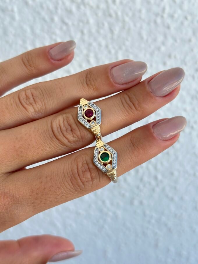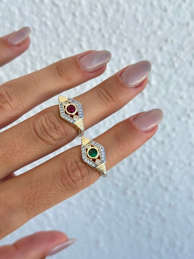 Göz formundaki tasarımıyla mistik bir şıklık sunan bu ayarlanabilir yüzük, zarif detaylarını rodyum kaplamayla buluşturuyor. Fuşya ve yeşil taş seçenekleriyle her stile farklı bir enerji katıyor: fuşya taş cesur ve canlı bir dokunuş sunarken, yeşil taş huzur ve zarafeti simgeliyor.