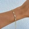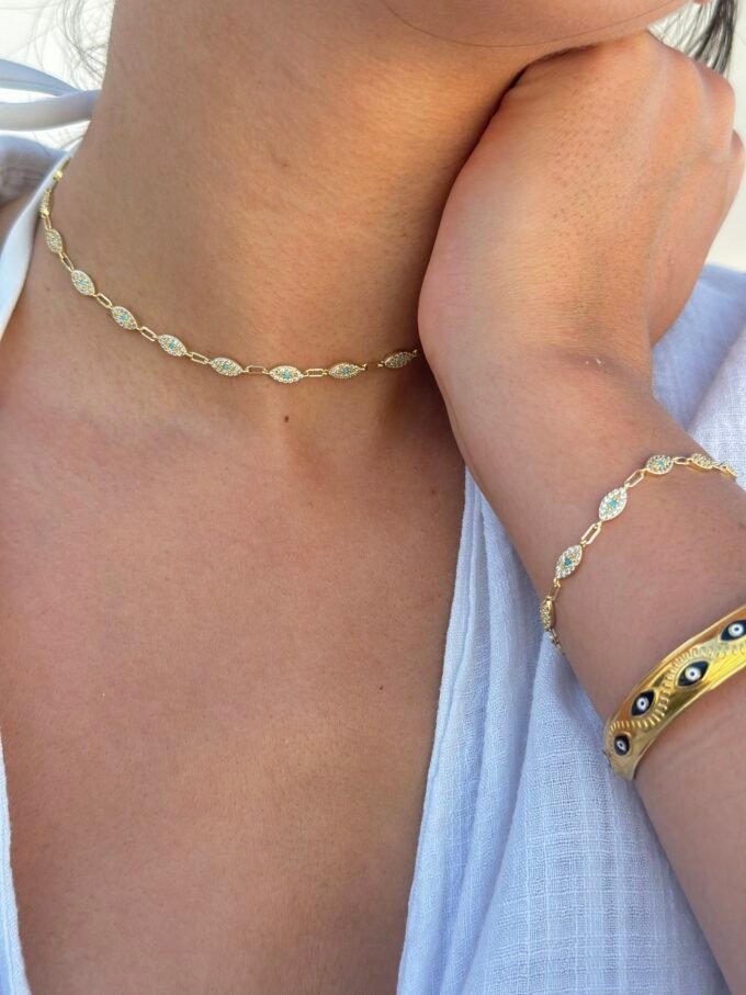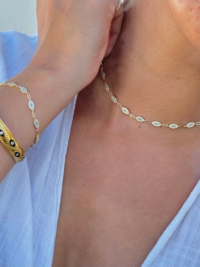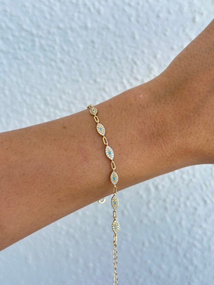 Elyora bileklik, sıra sıra dizilmiş göz formundaki figürleri ve kusursuz işçilikle yerleştirilmiş zirkon taşların büyüleyici ışıltısıyla tasarlandı. VIP rodyum kaplaması sayesinde uzun ömürlü parlaklık sunarken, yüksek kalite işçiliğiyle zamansız bir şıklık vadediyor.