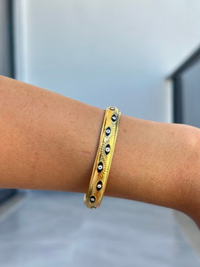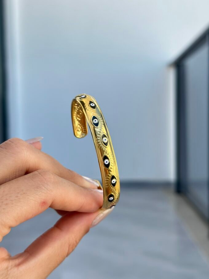 Eyvora , sağlam çelik kelepçe formu üzerine işlenen göz motifleriyle hem güçlü bir duruş hem de mistik bir koruyuculuk sunuyor. Gold tonlu kaplaması, modern çizgileri ve detaylı işçiliğiyle hem günlük kullanıma hem de özel anlara zarif bir dokunuş katar.