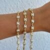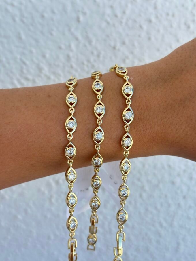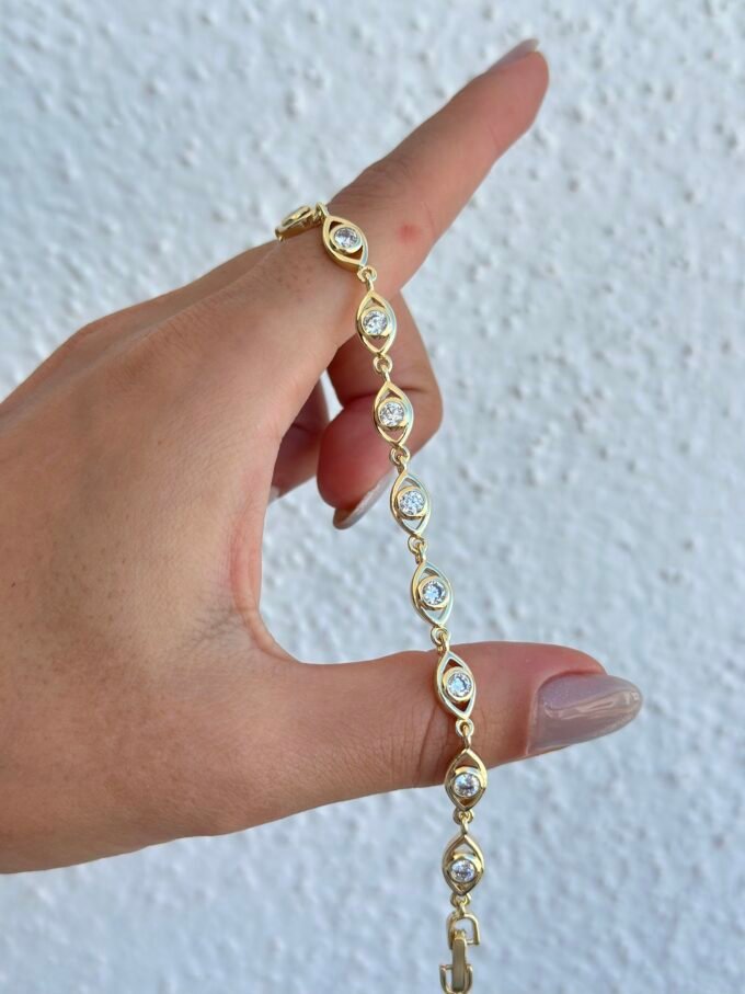 Bu bileklik, altın tonlu çerçeveler içinde parlayan zarif taşlarla tasarlandı. Her bir detay, hem şıklık hem de anlam taşır: göz formundaki dizilim, mistik bir enerjiyle çevrenizi korurken ışıltısıyla göz alıcı bir stil sunar.