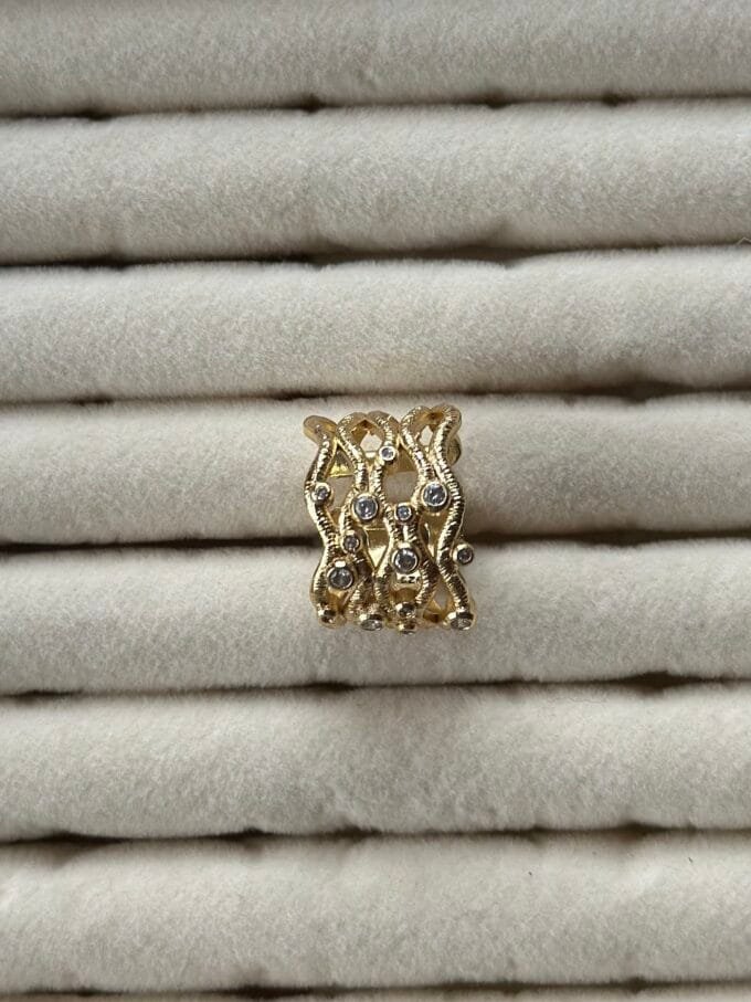 Ürünümüz, saf pirinçten el işçiliğiyle üretilmiştir ve yüzeyi lak kaplama ile korunmuştur. Alt kısmı tüm parmak ölçülerine uyum sağlayacak şekilde ayarlanabilir, böylece size en uygun şekilde kullanılabilir.