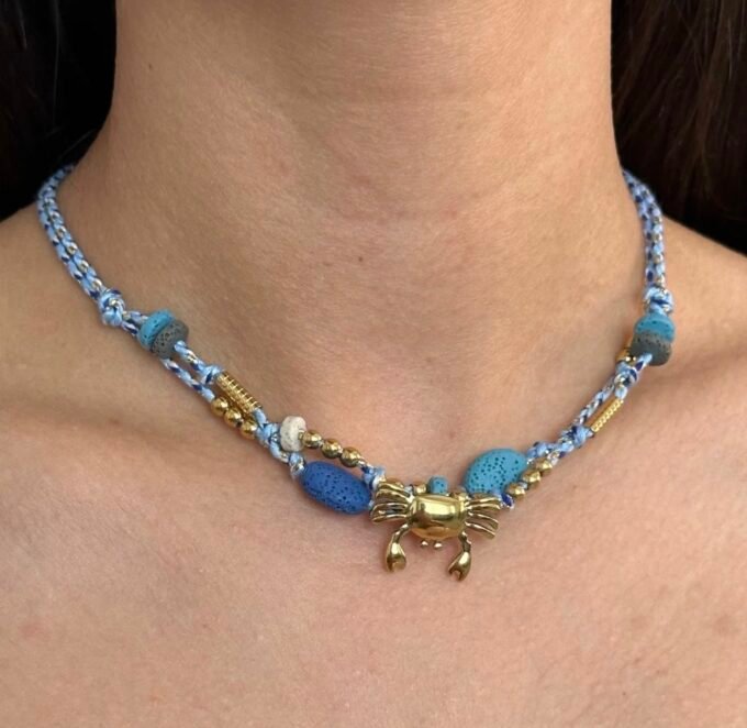 Ortasında güçlü bir yengeç sembolü, etrafında koruyucu çelik charmlar ve her an seni saracak bir mavi dokunuş.