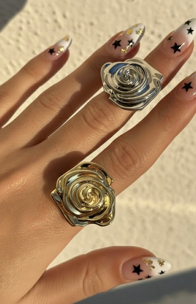 Geniş, parlak bandın üzerinde yer alan merkezdeki yıldız motifi, yüzeyi kaplayan ışıltılı zirkon taşlarla adeta gökyüzünden bir parça gibi parlıyor. Hem cesur hem de zarif bir duruş sergileyen bu yüzük, gün boyu konforunuzdan ödün vermeden stilinize sofistike bir dokunuş katar.