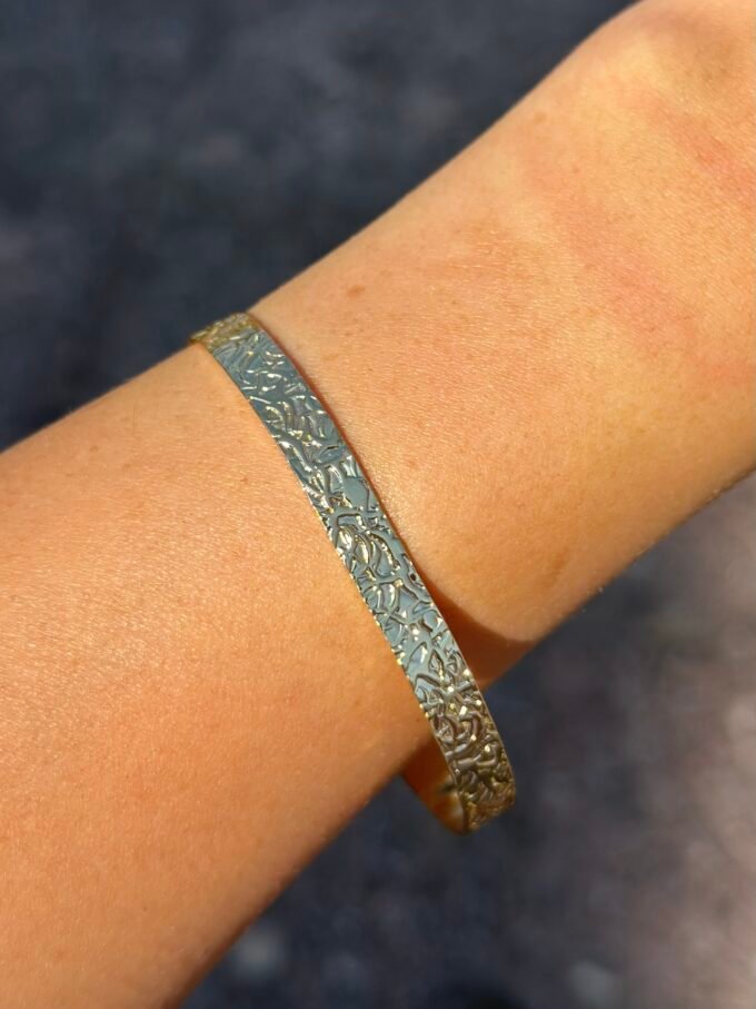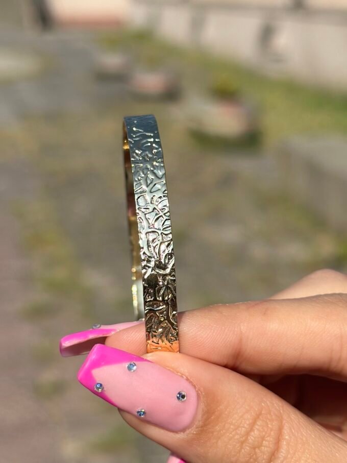 Doğadan ilham alan bu dokulu bileklik, zarafetiyle hem sade hem büyüleyici. Günlük şıklığına doğal bir dokunuş katmak isteyenler için.